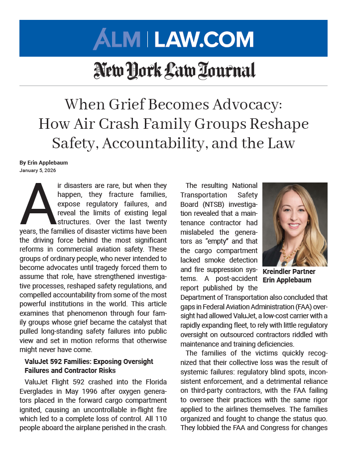 Erin’s other major cases at Kreindler include the Southwest Airlines Flight 1380 catastrophic engine failure and the Liberty Helicopters doors-off tour helicopter crash in the East River. For the past six years, Erin has played a key role in Kreindler’s fight against Boeing in the Ethiopian Airlines Flight 302/737 MAX litigation. She was appointed by the court as a member of the Plaintiffs’ Executive Committee for the Ethiopian Airlines Flight 302 cases and was instrumental in the victims’ families’ effort to overturn the Deferred Prosecution Agreement (DPA) between Boeing and the Department of Justice (DOJ).